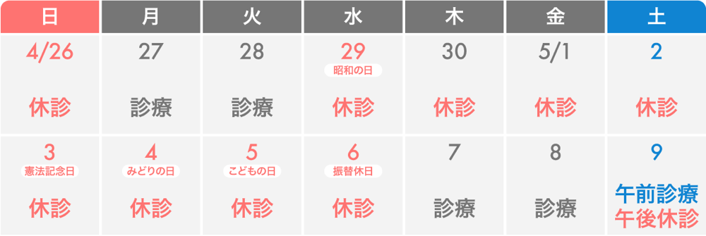 ゴールデンウィークは、4月30日(木)、5月1日(金)、2日(土)を休診とさせていただき、通常の休日とあわせて、4月29日(水)〜5月6日(水)まで休診となります。